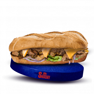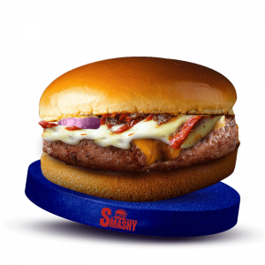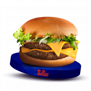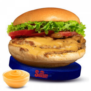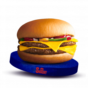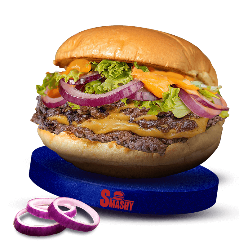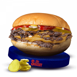 Potato bun, triple steak smashy black angus, oignons rouges, triple irish cheddar, ketchup heinz, yellow mustard, cornichons