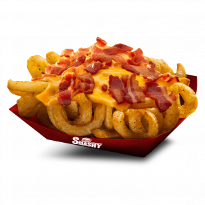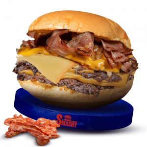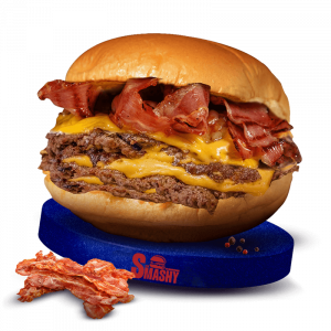 Potato bun, triple steak smashy black angus, triple irish cheddar, bacon de veau, sauce bbq
