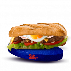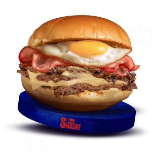 Potato bun, triple steak smashy black angus, triple tranche d’emmental, jambon, oeuf, sauce mayo-traiteur