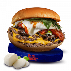 Potato bun, triple steak smashy black angus, triple irish cheddar, mozza, chorizo, tomate cerise, sauce cheezy