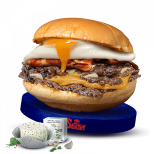 Potato bun, triple steak smashy black angus, triple irish cheddar, bacon de veau, oeuf, boursin, sauce cheezy
