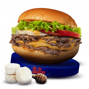 Potato bun, triple steak smashy black angus, triple irish cheddar, fromage de chèvre, miel, sauce honey mustard, salade, tomate, oignons rouges
